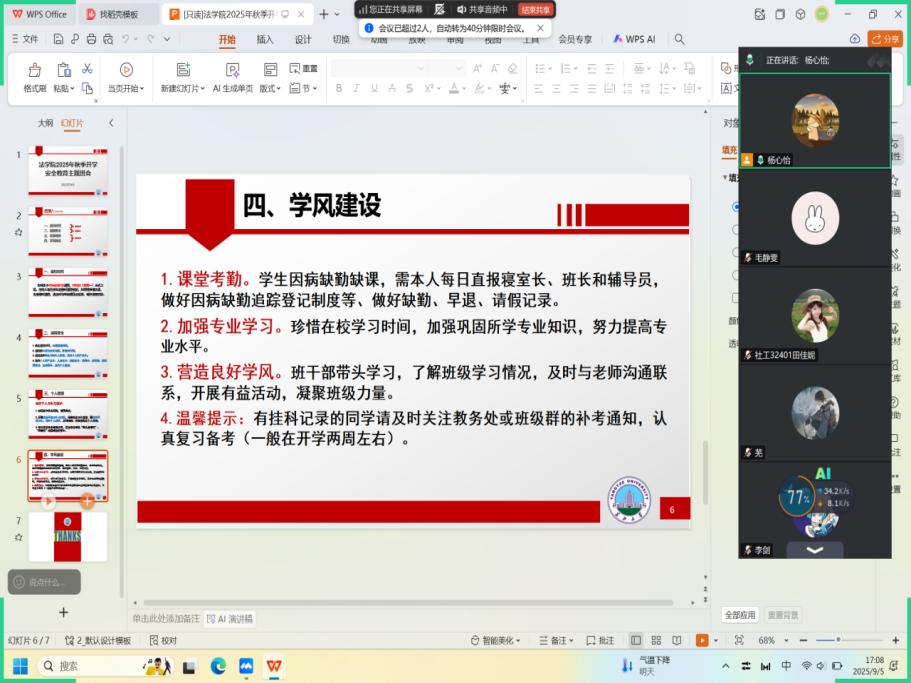 (通讯员 卢鸿彬)为帮助全体本科生、研究生快速调整开学状态,筑牢校园安全防线,保障新学期教学与管理工作平稳开局,9月2日,yl9193永利集团组织全院本科生与研究生班级依托腾讯会议等线上平台,同步开展开学安全教育主题班会。