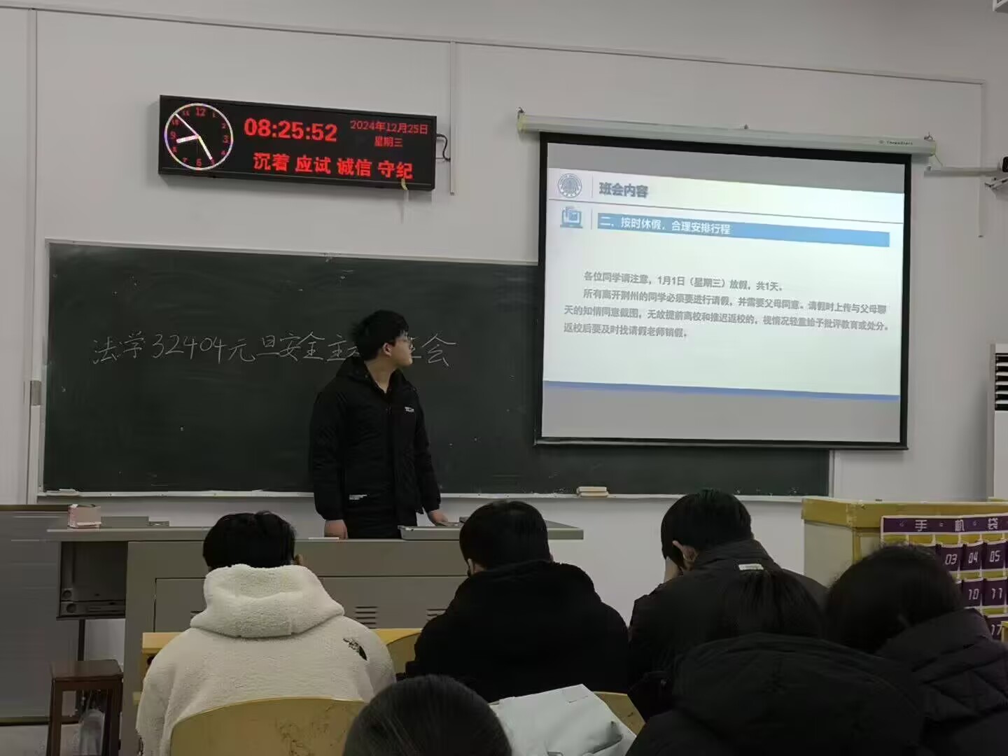 本次安全教育班会围绕元旦假期安全保障、诚信考试的重要性以及常规安全教育三大核心议题展开。首先,各班级的安全委员细致入微地介绍了元旦假期的具体安排,并着重强调了假期晚点名及打卡制度的重要性,确保能够实时掌握学生的假期动态,为学生们的假期安全筑起一道坚实的防线。