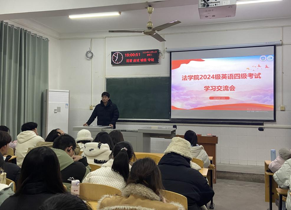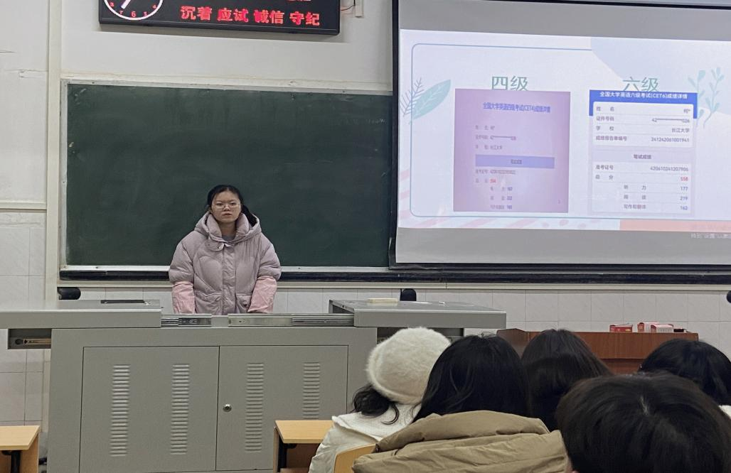 (通讯员:李玉豪/文 向若涵/图)为了全力支持yl9193永利集团2024级学生在即将到来的英语四级考试中取得佳绩,12月11日晚,一场以“经验分享,决战四级”为主题的英语四级考试交流会在西校区二教306室举行。此次交流会由23级曾祥学长与柯淼学姐主讲,李玉豪同学主持,高英班全体同学参加。