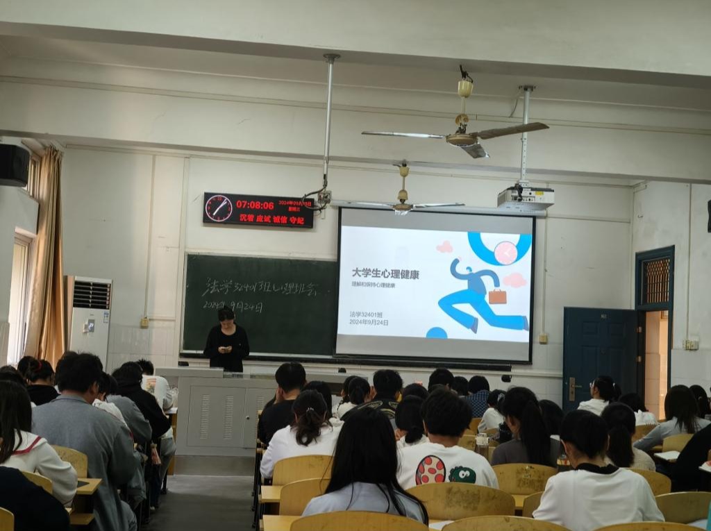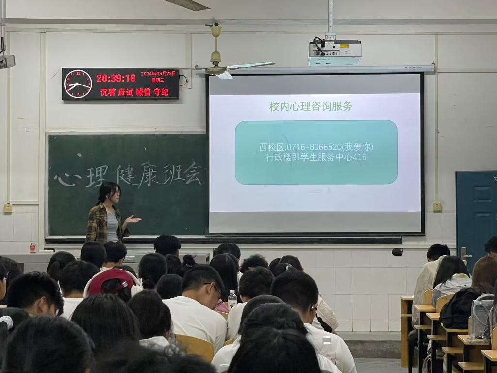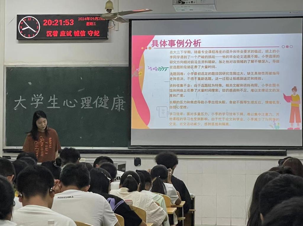 在班会开展过程中,心育委员们首先通过播放视频、PPT的形式,介绍了心理健康的基本概念,向同学们强调了心理健康是大学生全面发展的重要组成部分,对于学业进步、人际交往和未来的职业生涯都有着不可忽视的影响。同时,班委们结合新生入学初期的心理特点和实际需求,设计了丰富多样的活动环节,旨在通过互动与交流,引导同学们关注自身心理健康,学会自我调节和应对压力的方法。