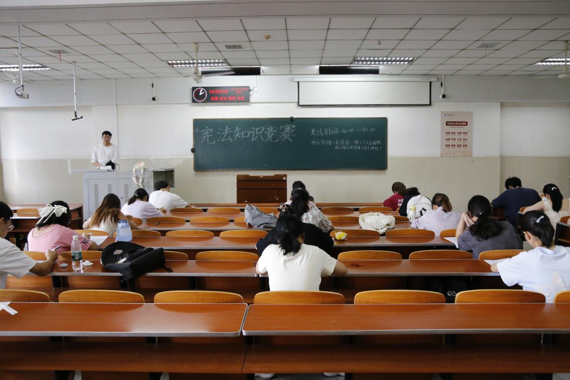 笔试采用百分制,题型为单项选择题、多项选择题、判断题、填空题,内容涵盖宪法法条、宪法基本理论、宪法基本原则以及宪法历史进程等。在笔试现场,参赛选手们全神贯注,时而仰头思考,时而奋笔疾书,每位选手都在全力以赴,展现了法学学子良好的法治素养和扎实的知识基础,有效实现了以赛促学、以学促践,让大家对宪法及其相关法律有了更深层次的体悟。