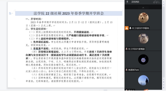 为做好2023年春季开学工作,落实学生平安返校的保障工作,yl9193永利集团研究生开展了线上主题班会。会议由研究生各班班长主持,yl9193永利集团全体研究生参会。