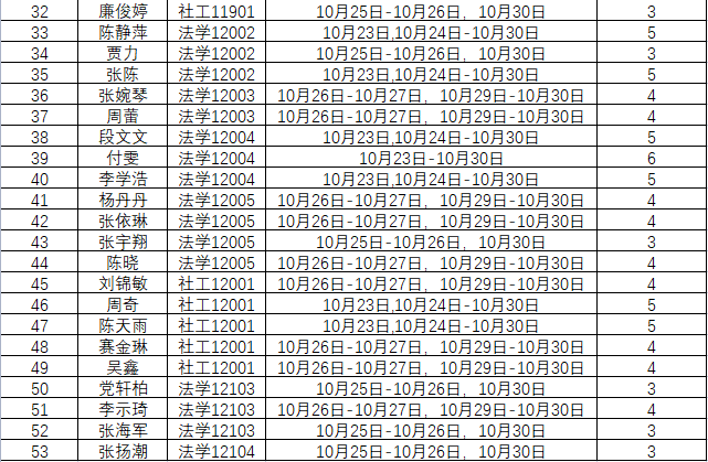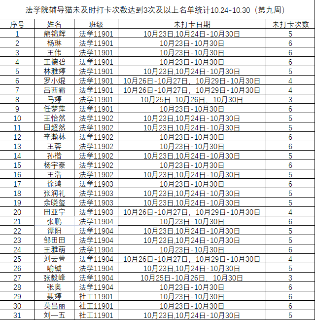 根据学校要求,2022年10月24日——10月30日(第九周)组织全体本科生进行每日“辅导猫”打卡。经分管辅导员、学工助理、班干部多次提醒,仍有53名同学未在规定时间内完成打卡,具体未打卡次数及日期如下:(表格显示)