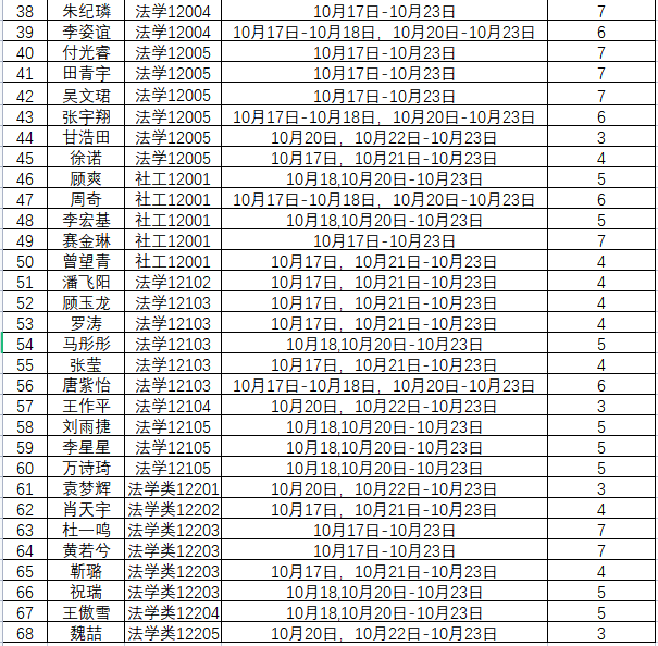 根据学校要求,2022年10月17日——10月23日(第七周)组织全体本科生进行每日“辅导猫”打卡。经分管辅导员、学工助理、班干部多次提醒,仍有68名同学未在规定时间内完成打卡,具体未打卡次数及日期如下:(表格显示)