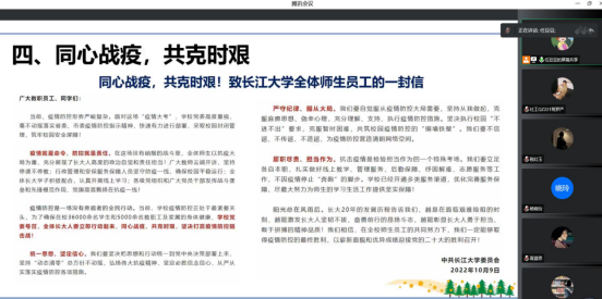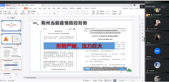 会上,任豆豆首先就当前荆州疫情防控形势进行了具体介绍,传达了学校相关防疫政策及战疫精神,通过学生违纪违规违法行为的案例,警示同学们要树立底线思维,遵守法律法规。接着结合学生当前存在的问题和需求提出解决方案和建议,并表示全体辅导员老师会24小时在线在岗,竭力为同学们服务。会议最后,由副院长唐飞进行总结,他希望yl9193永利集团全体研究生能够齐心协力,共同行动,共克时艰,同时强调同学们要遵守学校规定,不造谣、不信谣、不传谣,认真学习专业知识,做好自己的本职工作。