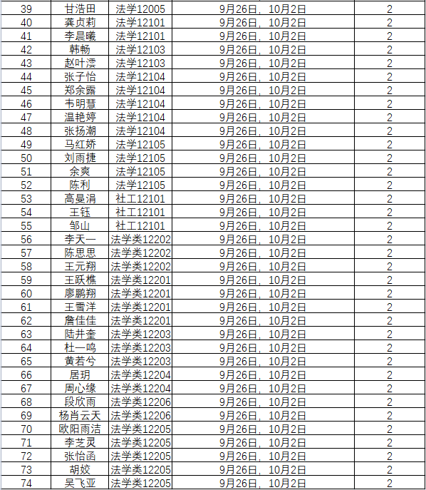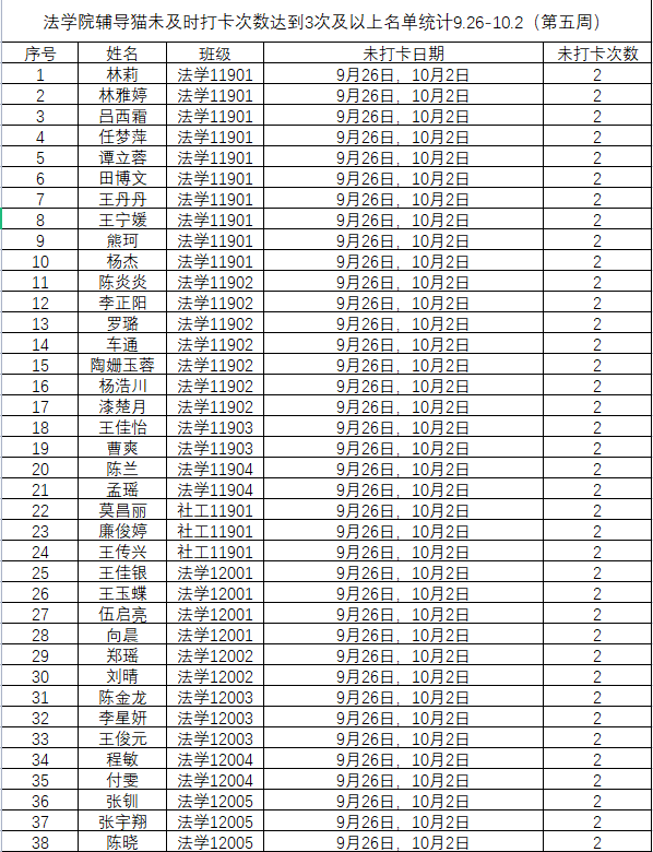 根据学校要求,2022年9月26日——10月2日(第五周)组织全体本科生进行每日“辅导猫”打卡。经分管辅导员、学工助理、班干部多次提醒,仍有74名同学未在规定时间内完成打卡,具体未打卡次数及日期如下:(表格显示)