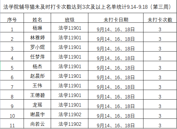 根据学校要求,2022年9月14日——9月18日(第三周)组织全体本科生进行每日“辅导猫”打卡。经分管辅导员、学工助理、班干部多次提醒,仍有11名同学未在规定时间内完成打卡,具体未打卡次数及日期如下:(表格显示)