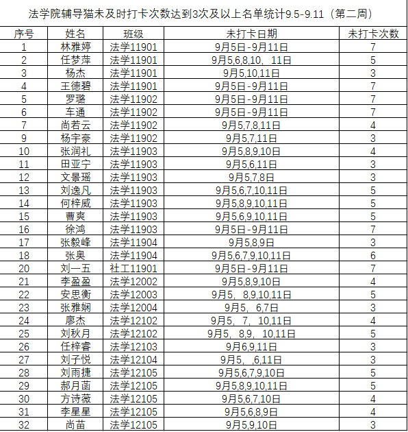 根据学校要求,2022年9月5日——9月11日(第二周)组织全体本科生进行每日“辅导猫”打卡。经分管辅导员、学工助理、班干部多次提醒,仍有32名同学未在规定时间内完成打卡,具体未打卡次数及日期如下:(表格显示)