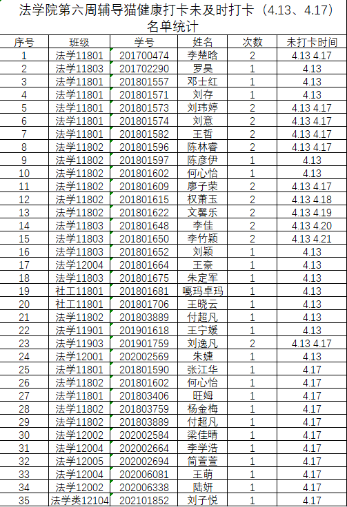 根据学校要求,2022年4月13日、4月17日(第八周)组织全体本科生进行每日“辅导猫”打卡。经分管辅导员、学工助理、班干部多次提醒,仍有35名同学未在规定时间内完成打卡,具体未打卡次数及日期如下:(表格显示)