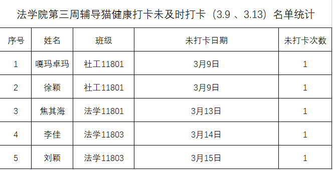 根据学校要求,2022年3月9日、3月13日(第三周)组织全体本科生进行每日“辅导猫”打卡。经分管辅导员、学工助理、班干部多次提醒,仍有5名同学未在规定时间内完成打卡,具体未打卡次数及日期如下:(表格显示)