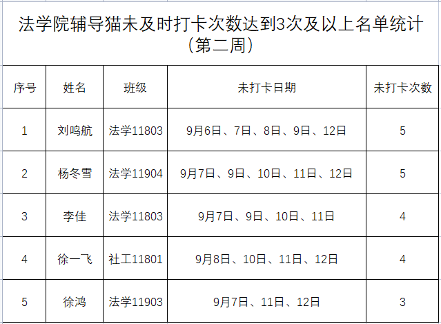 根据学校要求,2021年9月6日-9月12日(第二周)组织全体本科生进行每日“辅导猫”打卡。经分管辅导员、学工助理、班干部多次提醒,仍有5名同学未在规定时间内完成打卡,具体未打卡次数及日期如下:(表格显示)