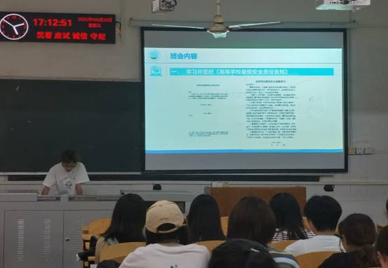 针对日常安全教育和暑期滞留学校学生的安全管理问题,从“常态化疫情防控”、“预防宿舍火灾与消防安全”、 “人身安全” 、“财产安全”、“交通安全”等各方面举例说明,并详细讲解了滞校须知、返校须知。提醒同学们加强自我安全保护,防范于未然,安全教育没有终点。让同学们真真切切的体会到安全的重要性,提高了自我防护意识。