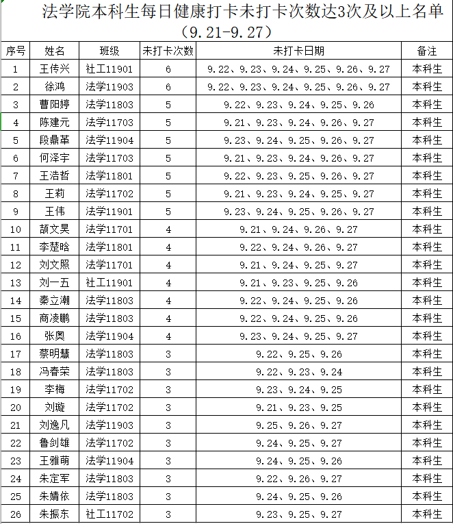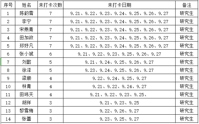 根据学校要求,2020年9月21日-27日组织全体本科生、研究生进行每日辅导猫打卡。经分管辅导员、学工助理、班干部多次提醒,仍有40名同学未在规定时间内完成打卡,具体未打卡次数及日期如下:(表格显示)