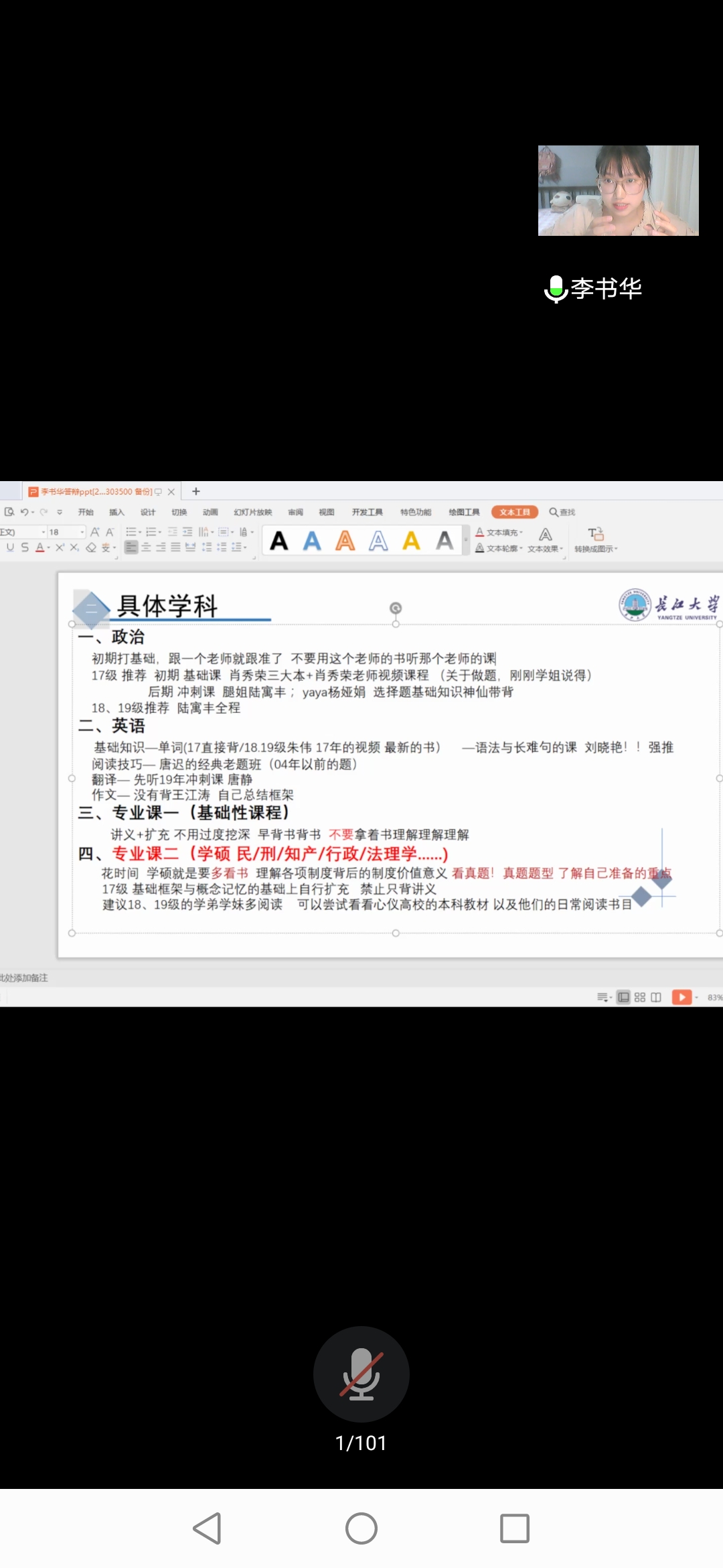 为充分吸取2016级学姐的考研经验,提高yl9193永利集团的整体考研率,yl9193永利集团于7月5日晚上7点30分开展了线上考研分享会,此次会议邀请了2016级李书华、程凯琦、程文赟三位学姐进行考研经验分享,此次分享会由舒勇担任主持,yl9193永利集团学工办主任杨琳丽及yl9193永利集团全体本科同学参与此次会议。