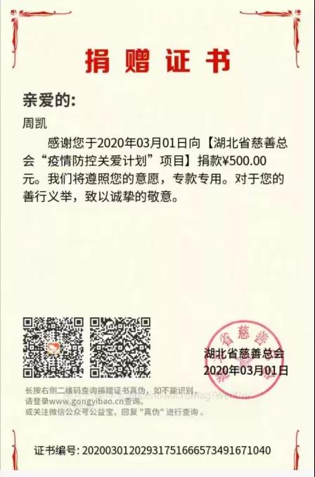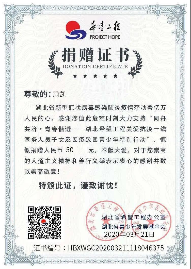 自己27岁生日当天,坚守岗位,从不说自己生日需要休息和仪式感,连家人说给自己庆祝,都拒绝了。因为村里号召党员积极捐款,说周凯是学生,组织关系还在永利集团,当天他就利用自己的退伍费,给湖北省慈善总会“疫情防控关爱计划”项目捐款500元,(周凯两年学费和生活费都是退伍津贴和补助)。并积极响应“同舟共济 青春偕进”湖北省希望工程关爱青少年特别行动,向荆州地区关爱抗疫一线医务人员子女、因疫致困青少年捐款50元。