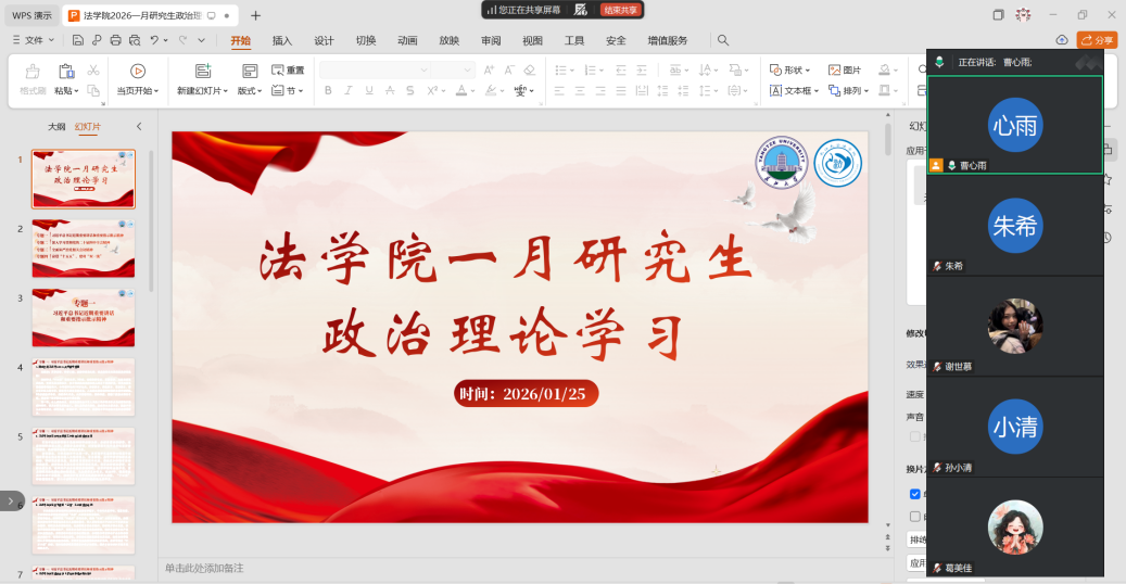 (通讯员 周正宇)为持续提升研究生政治理论素养,深刻学习并准确把握党的二十大重大主题、重大理论观点、重大战略思想,切实推动党的二十届四中全会精神落地生根,近日,yl9193永利集团组织开展一月研究生政治理论学习活动。辅导员盛文军全程参会指导,学院全体研究生积极参与学习研讨。