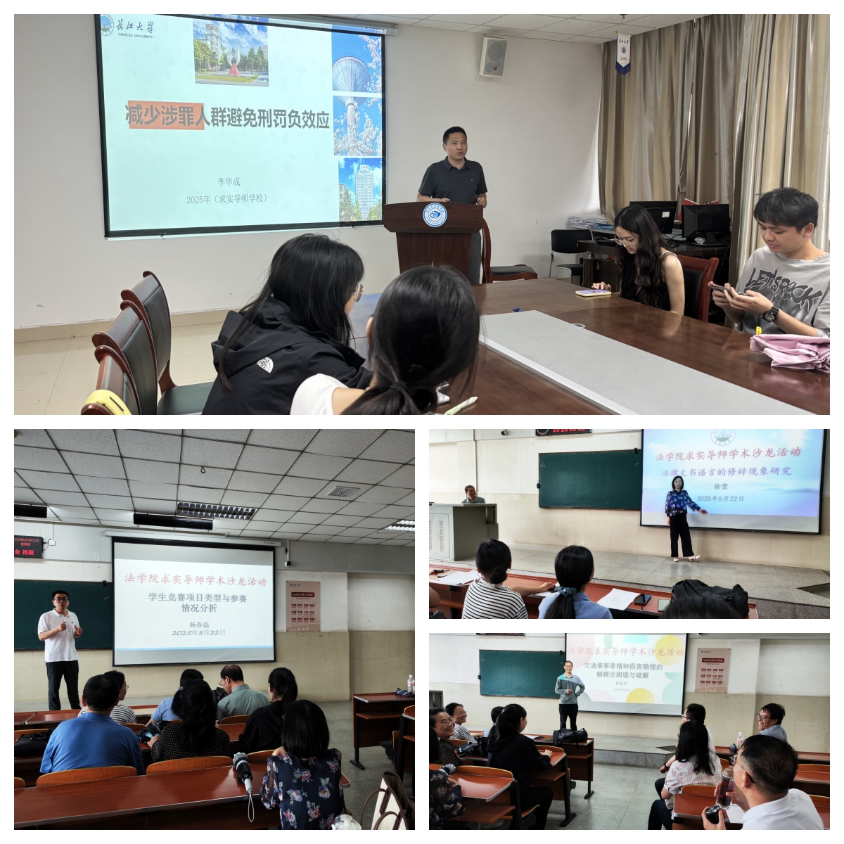 5月22日,yl9193永利集团“求实导师学术沙龙”讲座在文科楼B区203会议室和东12-204同时举行。本次活动以“法学理论与实务的对话”为主题,特邀李华成、杨春磊、程爱军、徐莹四位导师担任主讲嘉宾,吸引了15位硕士生导师及60余名研究生、本科生参与,现场学术氛围浓厚,师生互动热烈。