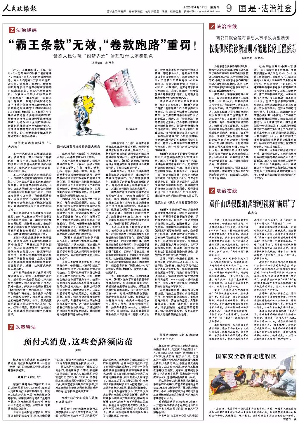 在预付式消费领域乱象频发的背景下,杨春磊教授继去年在《人民政协报》发表社会治理对策文章《如何惩治职业闭店人》后,于2025年4月16日再次就该热点话题接受采访,结合最高人民法院最新发布的《关于审理预付式消费民事纠纷案件适用法律若干问题的解释》(以下简称《解释》),深入解读司法新规对“卷款跑路”“霸王条款”等问题的治理路径,充分展现了学院在基层治理研究领域的前沿性与实践导向。