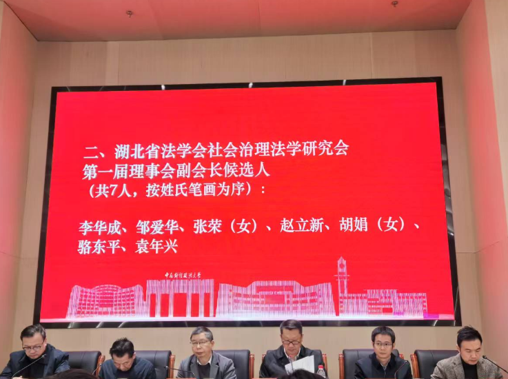 上午9时30分,湖北省法学会副会长蔡红耘主持进行湖北省法学会社会治理法学研究会第一届理事会换届选举。会议审议通过了《湖北省法学会社会治理法学研究会第一次会员代表大会选举办法》和《湖北省法学会社会治理法学研究会章程》,湖北省法学会调研员陈亚男宣读了《湖北省法学会关于同意社会治理研究会理事会人选的批复》,选举产生了湖北省法学会社会治理法学研究会第一届理事会。我院院长李华成教授当选为副会长,副院长杨春磊教授当选为常务理事,2011届法律专业校友原湖北斯洋(东湖高新)律师事务所主任陈凯律师当选为理事。