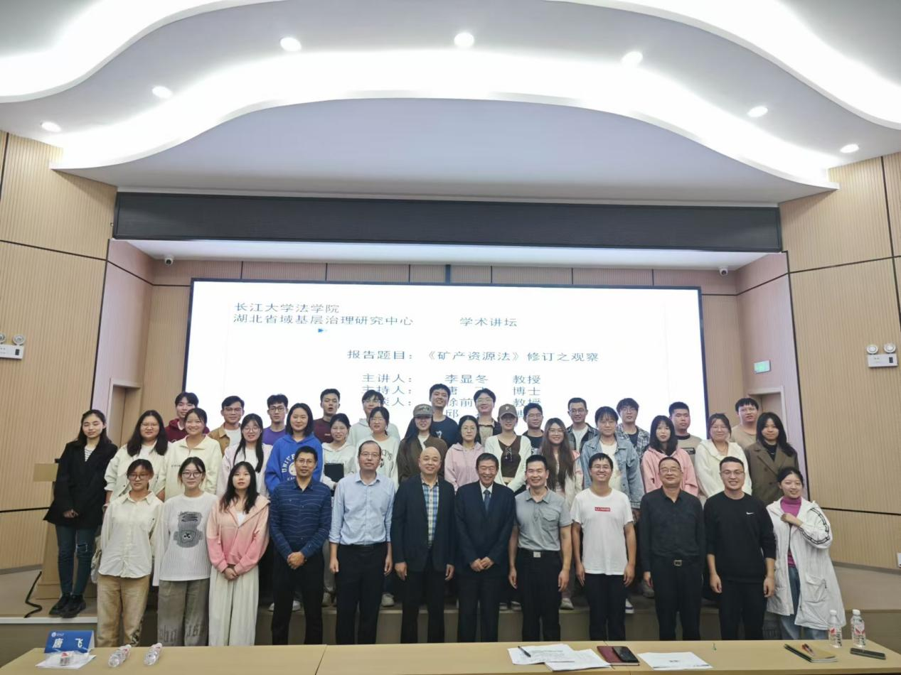 晚上7:00 在永利集团11教学术交流中心举行了yl9193永利集团及湖北省域基层治理研究中心学术讲坛,李显冬教授做“《矿产资源法》修订之观察”学术讲座。讲座由副院长唐飞主持,徐前权教授、邱祥博士与谈、yl9193永利集团党委书记周胜美,陈群辉、胡骑兵老师与学院硕士生和本科生参加了此次活动。