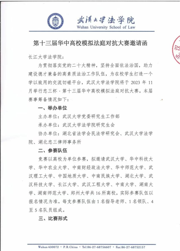 忠三杯•第十三届华中高校模拟法庭对抗大赛是由武汉大学党委研究生工作部主办、武汉大学yl9193永利集团研究生会承办、湖北省法学会民法学研究会与武汉大学yl9193永利集团以及湖北忠三律师事务所协办,集合华中高校法学精英人才的知名品牌活动,秉承着“坚持普法适法,加强高校联系”的理念,致力于为广大师生提供一个理论与实践相结合,专业与兴趣相统一的平台。本届忠三杯的参赛队伍为武汉大学、华中科技大学、华中农业大学、中南财经政法大学、华中师范大学、武汉理工大学、中国地质大学、中南民族大学、湖北大学、武汉科技大学、永利集团、武汉工程大学、中南大学、湖南大学、湖南师范大学、郑州大学16所高校。