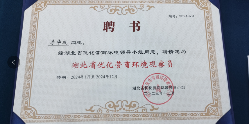 经湖北省优化营商环境领导小组公开选聘,李华成教授受聘为新一届优化营商环境观察员(2024.01—2024.12)。观察员职责主要有:(1)发现、收集和反馈在营商环境建设中的正反两方面现象;(2)监督和反映全省各地各单位贯彻落实《优化营商环境条例》、《湖北省优化营商环境条例》、省委、省政府出台的有关营商环境重要文件、依法行政、政务公开、行政审批等情况;(3)监督全省各地各单位推进法治政府、诚信政府建设情况等。