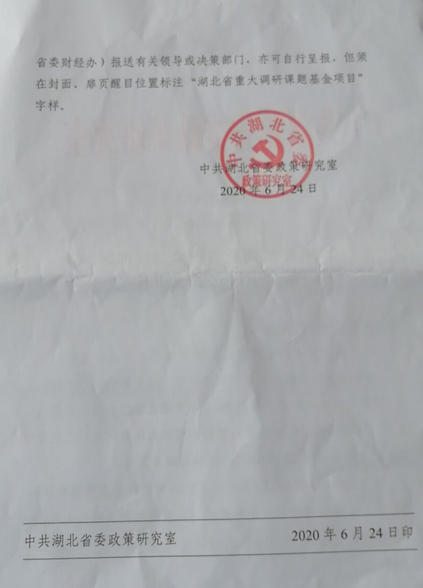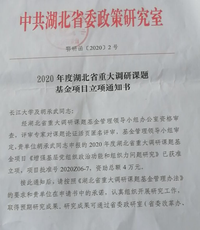 新闻网讯 6月24日,yl9193永利集团接湖北省重大调研课题基金管理领导小组办公室文件,胡承武老师申报的湖北省委重大调研课题《增强基层党组织政治功能和组织力问题研究》获准立项,项目金额4万元。