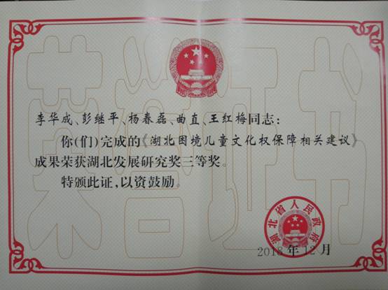近日,湖北省人民政府发文《省人民政府关于颁发湖北发展研究奖的通报》(鄂政发[2018]52号),荆州市人大常委会委员、yl9193永利集团副院长李华成博士团队研究成果《湖北困境儿童文化权保障相关建议》获三等奖。
