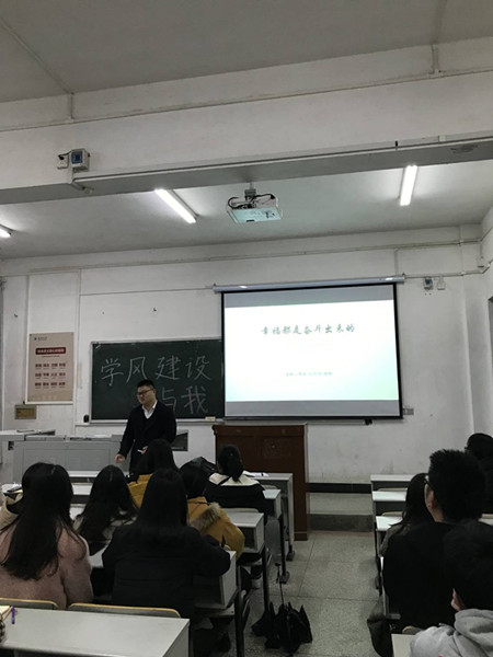 此次班会还邀请了学长周然林,他与大家一起分享他的学习经验。周然林做了“幸福是奋斗出来的”的主题演讲,他分别从“初心”、“信仰”、“心态”、“价值”、“核心”、“实在”等方面作了阐述,“学习生活中要不忘初心、坚定信念,”他说“当前最要紧的是扎实学科知识,提高自己的核心竞争力。”