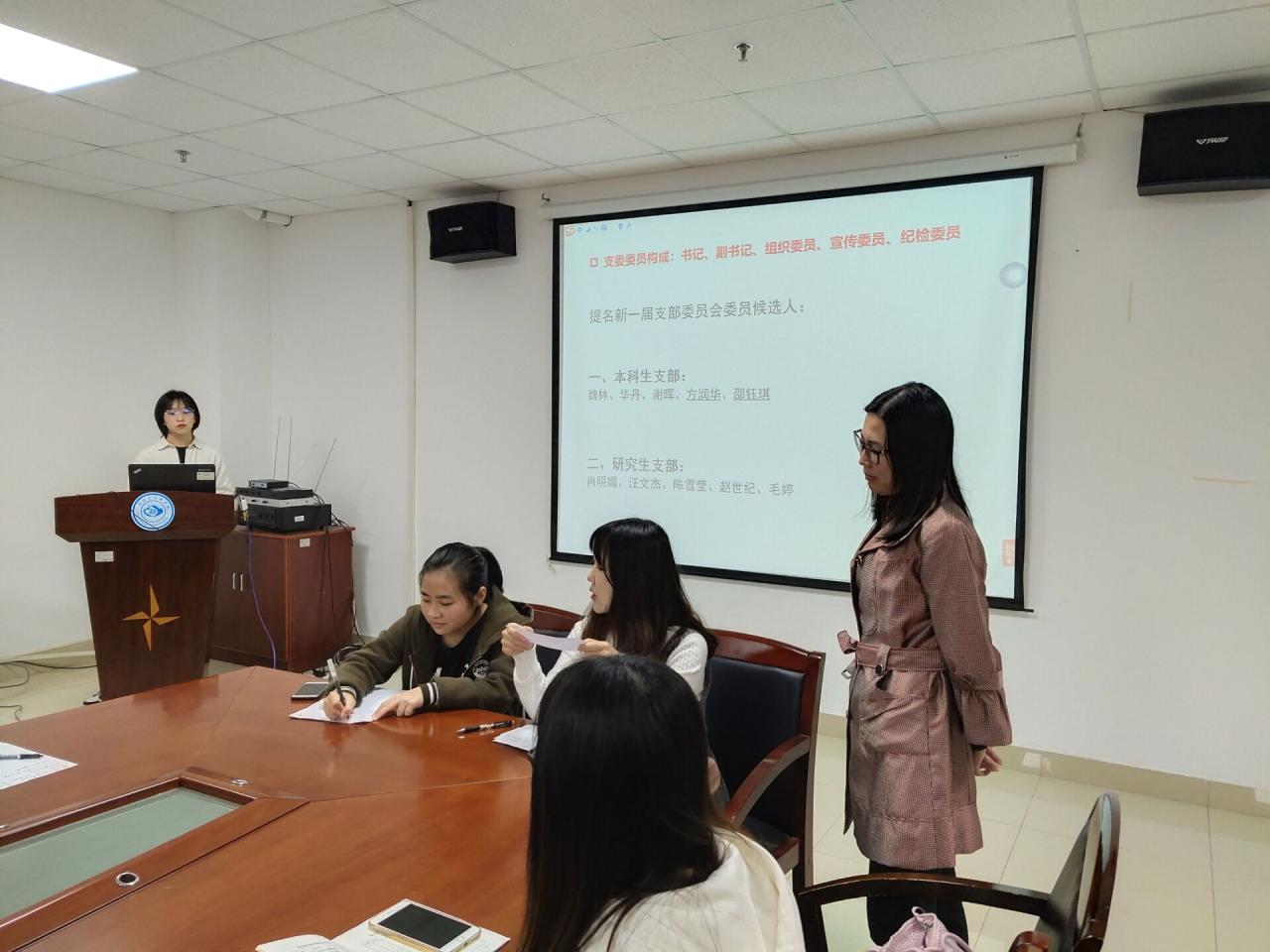 本次活动议程有支委换届选举、交纳党费、专题学习、主题研讨等四项内容。首先,由周晓峰老师主持换届选举,根据《中国共产党支部工作条例(试行)》相关要求,由上级党组织指派周晓峰、盛文军同志分别担任yl9193永利集团本科生支部和研究生支部书记。随后,公布由上级党组织提名的支委候选人,正式党员严格按照选举程序进行差额投票。由胡红霞书记监票,预备党员任豆豆、田梅萍分别负责唱票和计票,选举产生本科生支部支委成员魏林、谢晖、华丹、邵钰琪,研究生支部支委成员汪文杰、赵世纪、毛婷、肖明媚。随后,胡红霞书记表示,以后,将从严支部建设,严格把控推优、发展党员等各项工作,同时也殷切希望党员同志们能重视每月主题党日学习活动,守规矩、讲纪律、做表率。