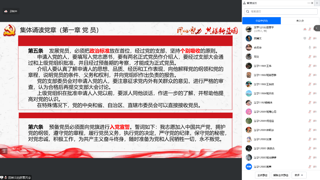 易海燕同志首先带领全体党员重温入党誓词,砥砺前进初心。全体党员通过诵读《党章》第一章“党员”,学习了党员的义务、权利、责任,对党员的先进性要求有了进一步理解。在理论学习环节,主持人带领全体党员学习了《习近平谈治国理政》第四卷第六至第十部分、中共中央政治局常务委员会会议上关于疫情防控工作的报告与部署、二十大代表路丙辉的光荣事迹、《中共永利集团委员会关于深入学习宣传贯彻党的二十大精神的通知》。