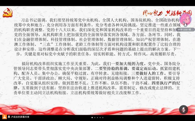 活动伊始,由卢成志同志带领党支部全体党员重温入党誓词,全体党员集中学习了党章第七章的内容,深入了解党的纪律有关知识。支部党员周心男同志讲授了题为《深入党和国家机构改革》的微党课,深化党和国家机构改革是贯彻落实党的二十大精神的重要举措,是推进国家治理体系和治理能力现代化的集中部署。