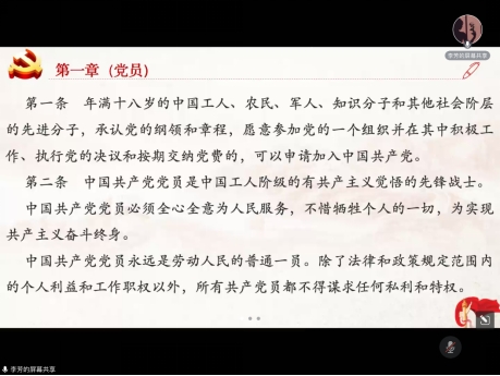 在集体诵读党章环节,党员同志集体学习《中国共产党章程》第一章,通过主持人领读的方式对党员的定义、权利与义务等相关内容进行学习。