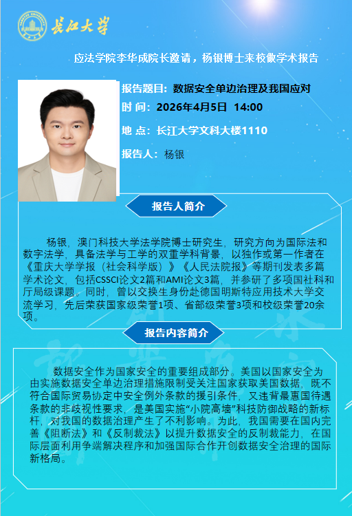 上一条:长江法治讲坛(2026年第6期)外空安全国际治理面临的新挑战及应对