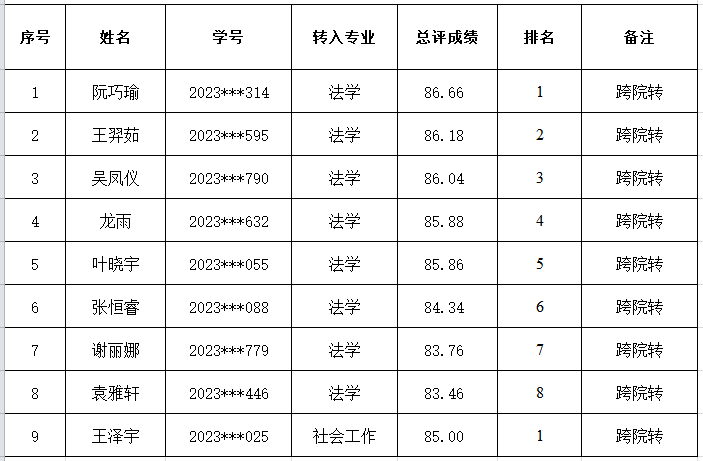 根据《永利集团普通本科生专业分流与转专业管理办法(试行)》(长大校发〔2019〕260号)文件以及本科生院《关于2023级普通本科生秋季学期转专业工作的通知》要求,结合yl9193永利集团2023级本科生转专业工作方案的具体安排,我院于9月7日上午组织了对拟转入学生的面试。综合必修课成绩和面试成绩,经我院党政联席会讨论通过,现将拟接收名单公示如下: