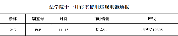 根据学校十一月宿舍巡查情况,我院共有1间寝室使用违规电器,具体情况如下:(表格显示)