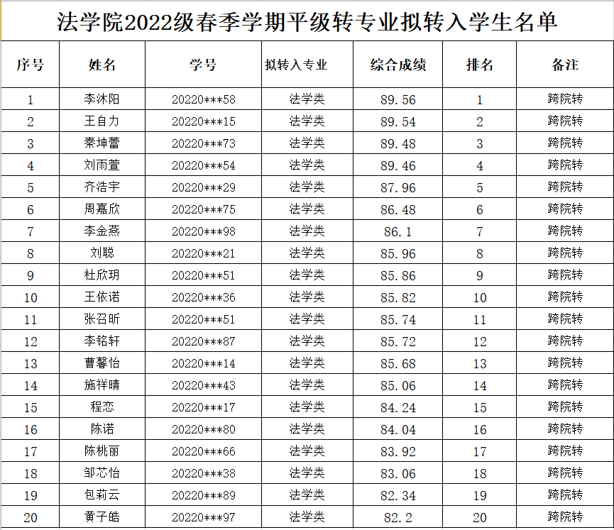 根据教务处《关于开展2022级普通本科生春季学期转专业工作的通知》、《永利集团普通本科生专业分流与转专业管理办法(试行)》(长大校发[2019]260号)和《yl9193永利集团2022级普通本科生春季学期平级转专业工作方案》,经学生本人申请,教务处资格审核,我院对通过审核的52名学生进行了面试考核。按照综合成绩=必修课平均成绩*40%+面试成绩*60%,综合成绩分由高到低排序,经学院党政联席会议讨论通过前20名为拟接收转入人员,现将名单予以公示。