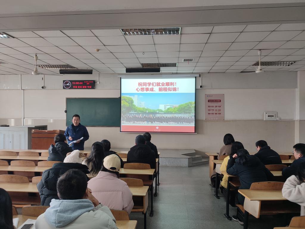 会议第二部分,辅导员盛文军做毕业生就业动员大会,汇报了今年考公考编上岸情况,要求大家关注各类就业信息,介绍了学校网上签约系统。